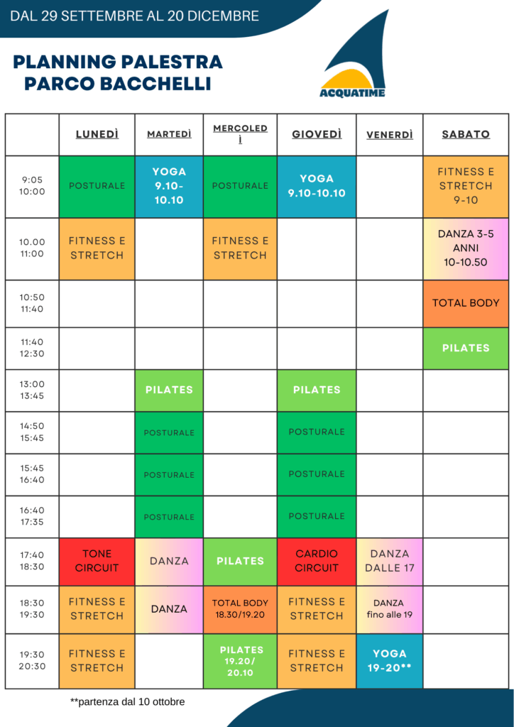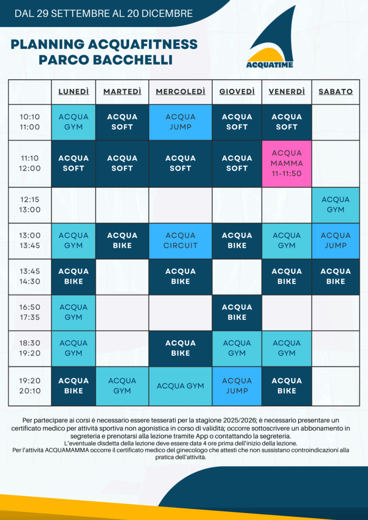 Durante tutto l’anno organizziamo corsi di fitness dentro e fuori dall’acqua, con e senza attrezzi. In particolare d’inverno i corsi di terra si tengono in palestra e d’estate nel parco della piscina estiva.